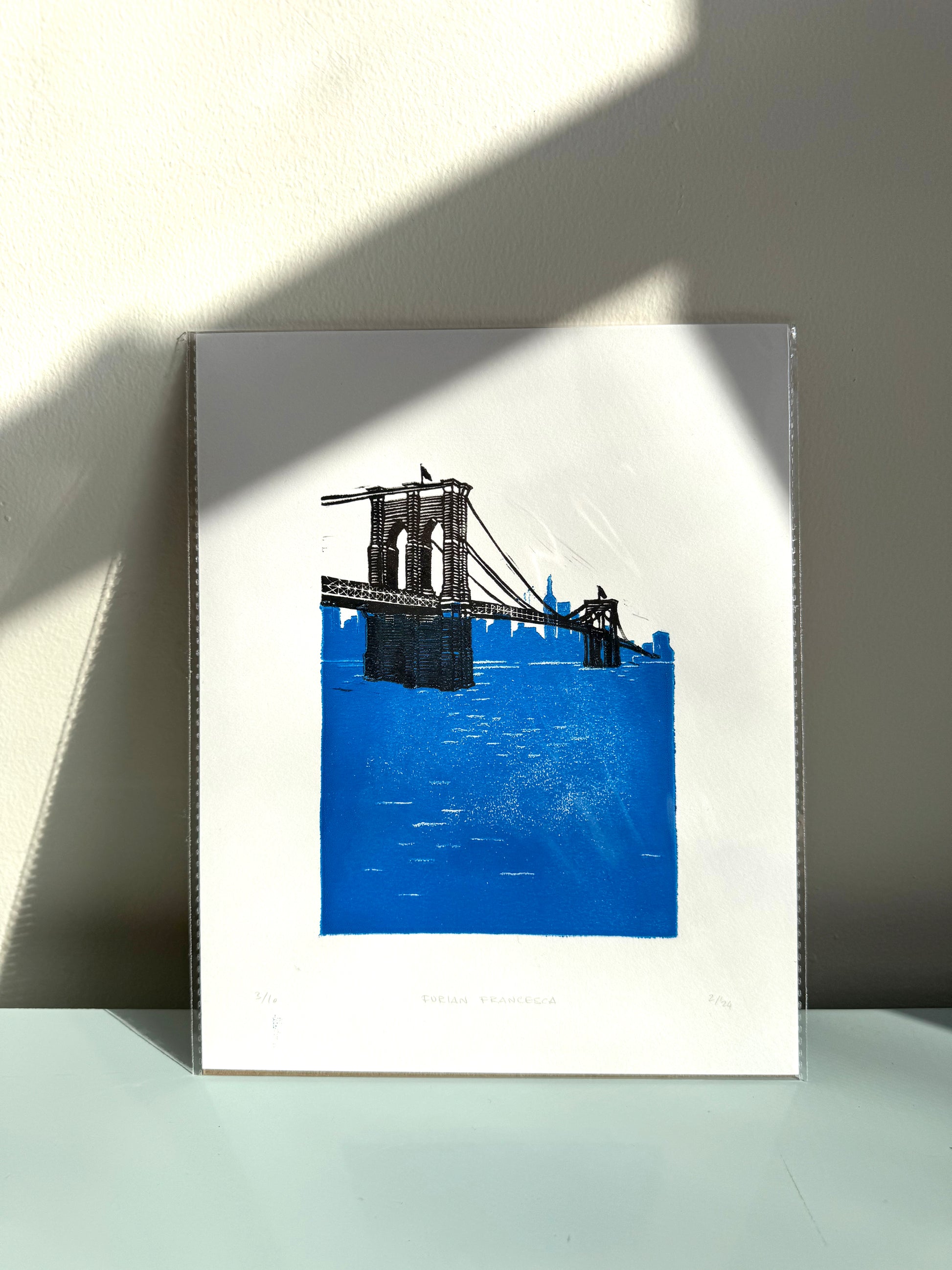 Multi-layer relief print features New York's iconic Brooklyn Bridge. Printed by hand with professional oil-based relief inks in bright colors on lightweight Strathmore paper. Each print is part of a limited series. They come in cellophane clear bags with cardboard backing or framed (in 11.5 x 9.5).