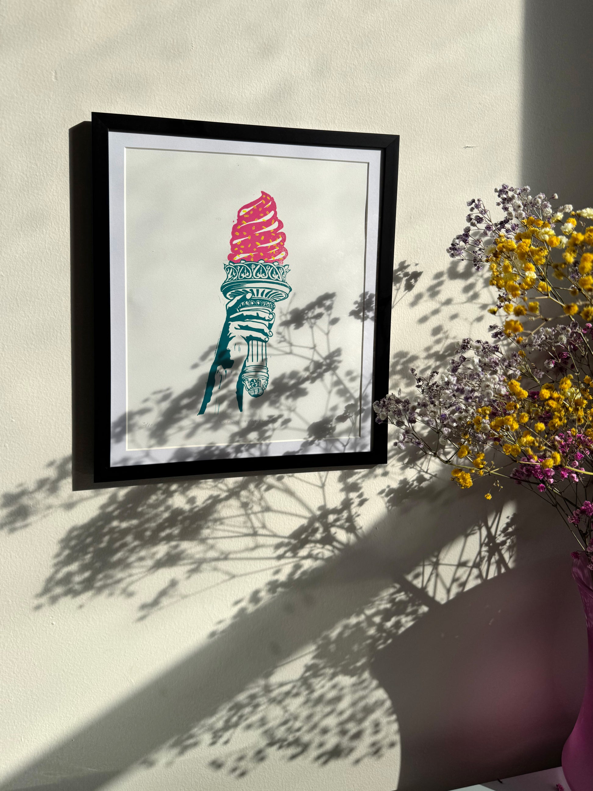 Multi-layer relief print featuring the iconic Statue of Liberty with summer vibes. Printed by hand with professional oil-based relief inks in bright colors on lightweight Strathmore paper. Each print is part of a limited series. They come in cellophane clear bags with cardboard backing or framed (in 11.5 x 9.5).
