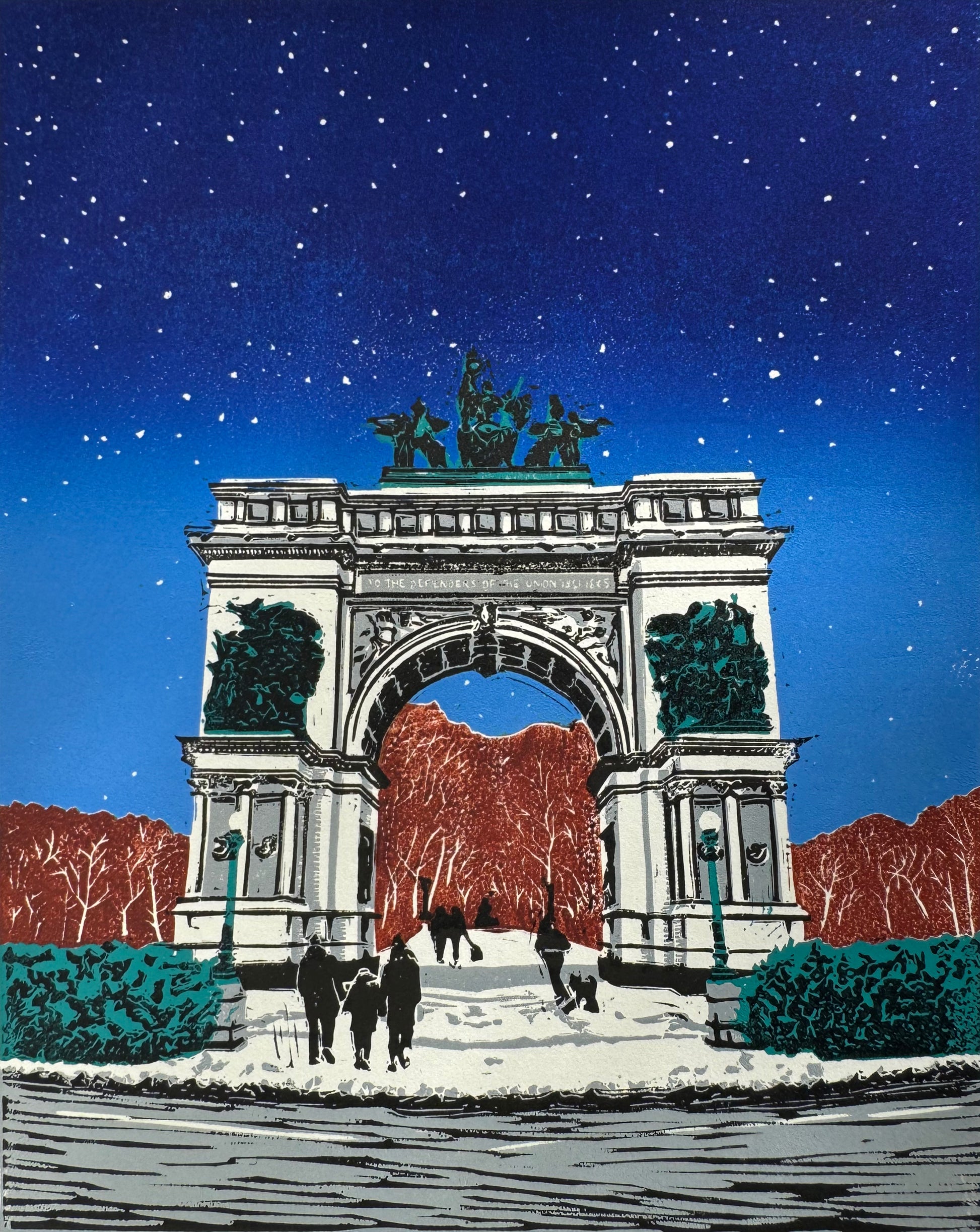 Multi-layer relief print features the Soldiers & Sailors Memorial Arch in Brooklyn, which has also been published in Park Slope Reader Magazine (Winter 25/26, issue #95). Printed by hand with professional oil-based relief inks in bright colors on cotton Stonehenge paper. Each print is part of a limited series. They come in cellophane clear bags.