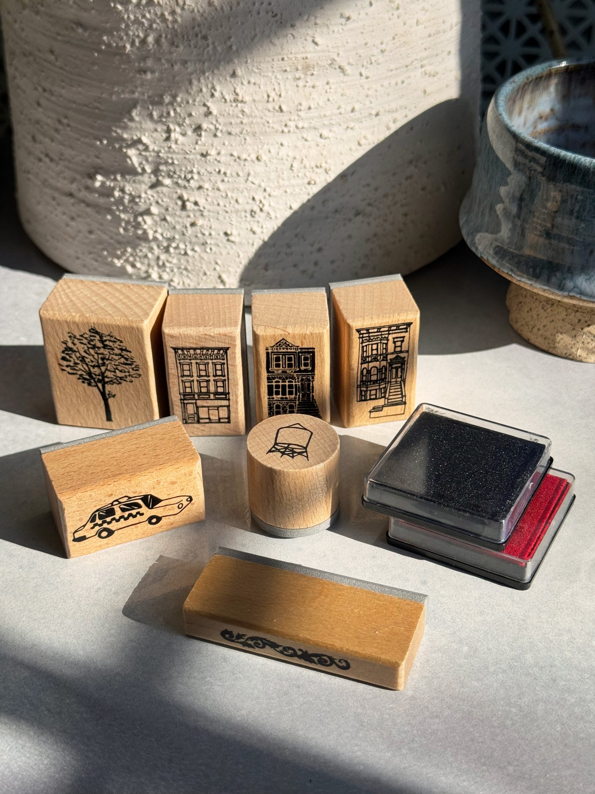 This Brooklyn-inspired stamp set includes 7 wooden rubber stamps and 2 ink pads (black and red) bundled in havana box packaging in 5x6x1.